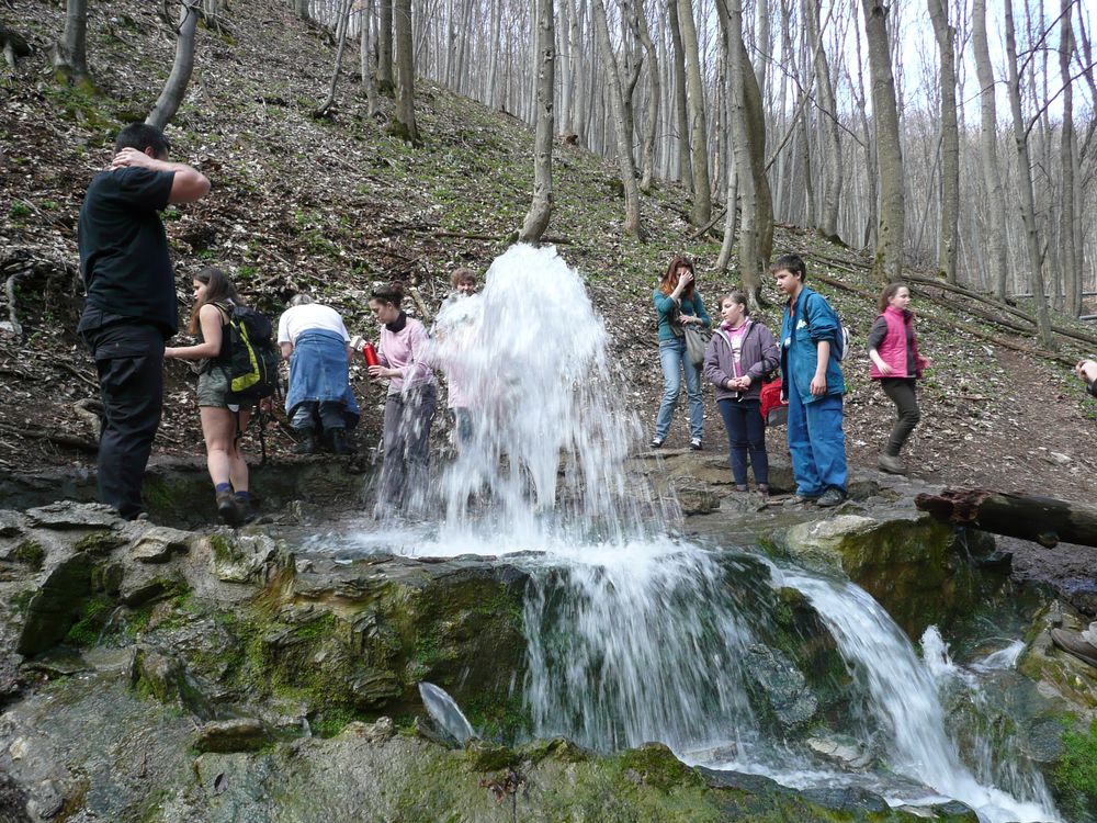 Az Imó-kő és a Vörös-kő alatt található különleges időszakos forrásokat keresünk fel, amelyek főként kora tavasszal, hóolvadás után aktívak. A képen a Vörös-kő forrás látható, amint szökőkútként tör a felszínre.