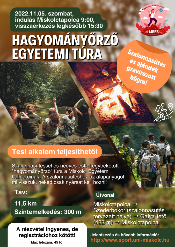 Programváltozás: A korábban meghirdetett "Túra Kékmezőre" című túra helyett, egy időközben a Sportközpont által erre a napra szervezett "Hagyományőrző Egyetemi Túra" lesz megtartva.