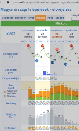 * A várható időjárást figyelembe véve egyelőre megtartunk egy „könnyű” (3 pontos) túrát, az eredeti indulási paraméterekkel. Szalonnasütés ezen a napon (szept. 23.) nem lesz. Eső lesz, de az még nem akadálya egy gyalogtúrának. (A Búza téren a busz indulási helyétől ötven méterre lévő kertészáruház 7:30-kor nyit; ott is lehet találni esőköpenyt.) Alkalmas lábbelit kell viselni; biztosan nedves lesz. Ha nincs komoly fennakadás és lassító körülmény, akkor dél körül érünk a „könnyű” túra végére. A met.hu a zivatart (villámlások, esetleg felhőszakadás) Miskolc környékére későbbi, délutáni órákra jelzi. A folytatásra (a hosszabbik távra, Kácsig) kevés esély látszik, ezért merült fel, hogy most inkább Miskolctapolca felé vegyük az irányt, úgy visszafelé kevesebbet kell utazni. Ha nem lesz most 6 pontos táv, akkor október 1.-re vagy 15.-re (vasárnap) várható egy póttúra, az eredetihez hasonló (latori-kácsi) útvonaltervvel.